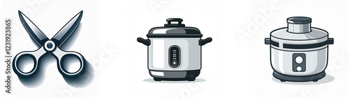 Scissors, rice cooker, pressure cooker shown; kitchen tools for cutting and cooking.