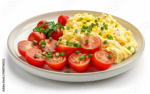 scrambled eggs, egg, cherry tomato, tomatoes, chives, parsley, garnish, breakfast, brunch, meal, healthy, food, yellow, red, green, plate, dish, isolated, white, background, still life, studio shot, epicure, culinary, simple, easy, cooked, served, fresh, organic, alimentary, protein, vegetarian, delicious, savoury, herb, vegetable, morning, deliciously