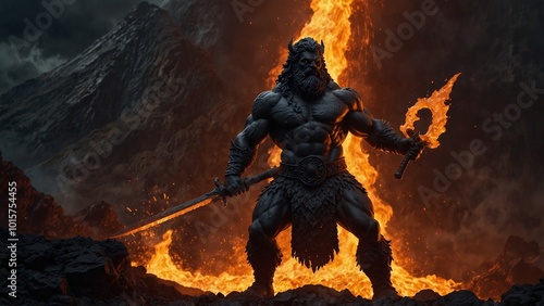 Sculpt Heracles forging weapons at the edge of a volcano, holding a molten lava sword, set against an erupting volcano and flowing lava, symbolizing the combination of strength and creation.