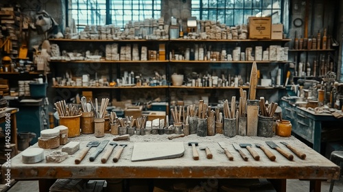 sculpting, tool, workshop, workbench, studio, art, craft, clay, pottery, carving, modelling, sculpture, artist, creation, design, hand, process, material, texture, wood, metal, stone, paint, brush, knife, palette, supply, equipment, space, messy, organised, detail, craftsmanship, skill, talent, creativity, inspiration, profession, occupation, hobby, passion, dedication, sharpened, concentration, traditional, vintage, antique, industrial