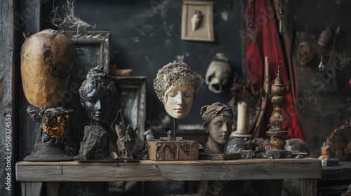 Sculpture collection in moody antique room with vintage statues, pottery and dark dramatic lighting