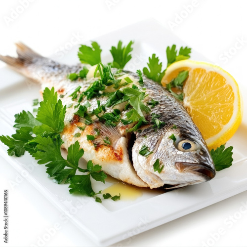 sea, bream, isolated, fish, food, lemon, seafood, fresh, healthy, plate, grilled, trout, dinner, fried, dish, meal, baked, white, cooking, raw, bass, epicure, green, diet, prepared
