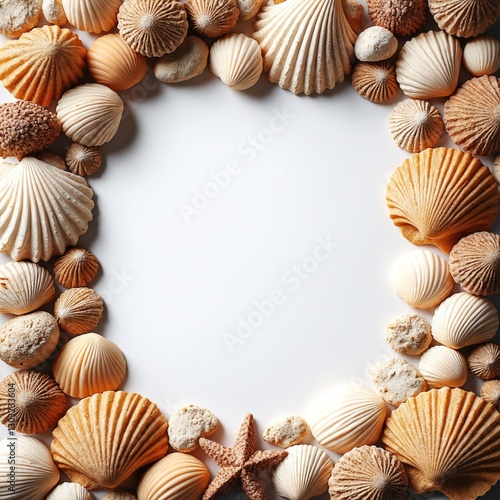 Sea ​​shells frame border, copy space on a side, minimalist art style