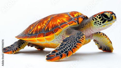 sea, turtle, reptile, shell, ocean, wildlife, animal, nature, tropical, marin, water, beach, colourful, pattern, green, orange, yellow, black, blue, scale, head, eye, fin, flipper, leg, tail, beak, carapace, fauna, exotic, underwater, life, aquatic, conservation, endangered, photo, closeup, macro, studio, white, background