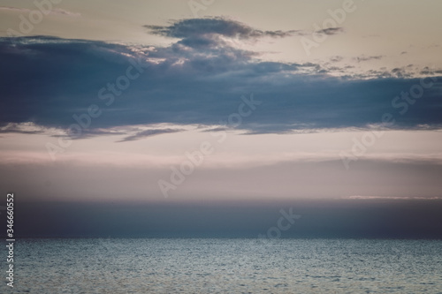 Sea view during sunset. Small clouds. Quiet wind, warm.