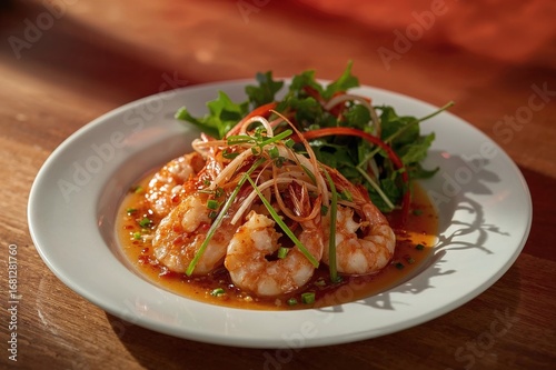 Seafood dish prepared with a unique method, featuring shrimp in a healthy salad meal