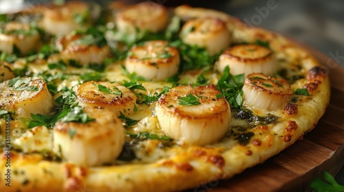 Seafood Pizza with Scallops and Parsley on Golden Crust
