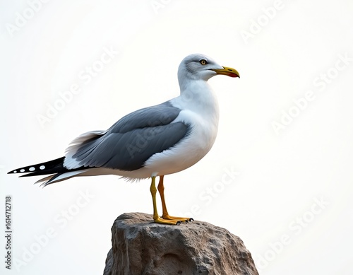 Seagull bird perched on rock. Features white gray plumage, yellow beak, yellow legs. Clear white background. Focus on seabird details, feathers, wings. Natural wildlife scene.