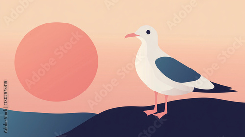 seagull standing on a hill during sunset in a minimalistic digital illustration