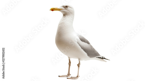 seagull, bird, standing, white, background, animal, wildlife, nature, coastal, feather, yellow, beak, graceful, upright, shore, sea, ornithology, plumage, avian, marin