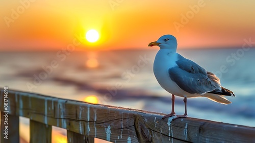seagull, bird, sunset, beach, ocean, water, gold, hours, sky, horizon, sea, coast, wave, calm, peaceful, nature, wildlife, animal, photo, light, sun, cloud, orange, warm, colours, soft, marin, coastline, twilight, dusk, evening, summer, beautiful, outdoors, travel, vacation, landscape, background, natural, view, breakwater, pier, fence, wood, post