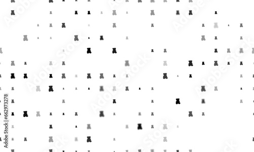 Seamless background pattern of evenly spaced black teddy bear symbols of different sizes and opacity. Vector illustration on white background
