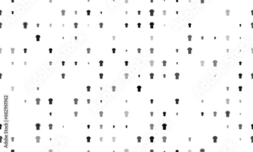 Seamless background pattern of evenly spaced black t-shirt symbols of different sizes and opacity. Illustration on transparent background