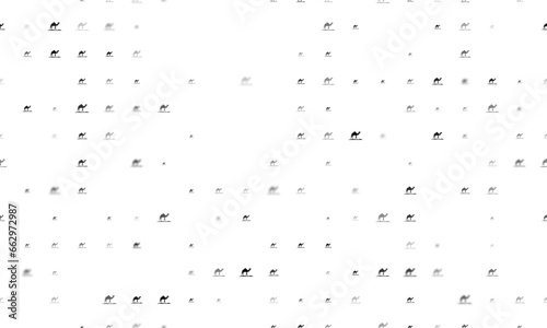 Seamless background pattern of evenly spaced black wild camel symbols of different sizes and opacity. Vector illustration on white background