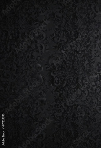 Seamless black gothic wallpaper; swirling vines & damask , ornate pattern, baroque, black wallpaper