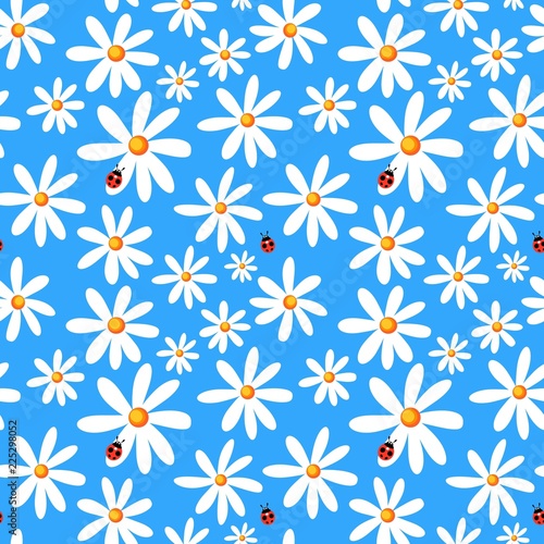 background, seamless, chamomile, pattern, chamomile, white, design, illustration, summer, wallpaper, floral, daisy, decoration, nature, flower, plant, blossom, insect, texture, drawn, colours, coccinellidae, textile, spring, fabric, art, repeat, yellow, graphic, season, bloom, drawing, beautiful, blue