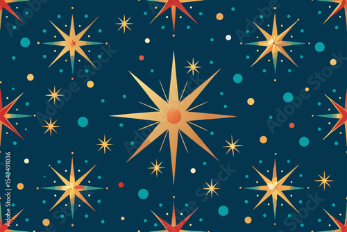 Seamless blue sky vector pattern with bright stars, perfect for Christmas or holiday celebration backdrop