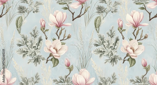 botanical, floral, magnolia, pattern, blossom, seamless, design, flower, elegant, nature, repeating, texture, wallpaper, background, spring, summer, print, artistic, decoration, delicate, beautiful, vintage, style, textile, fabric, blossom, bloom, tree branch, leaf, garden, artwork, watercolor, graphic, natural, pastel, template, surface, arrangement, botany, plant, leaf, bud, foliage, ornamental, flourishing, fresh, vibrant, creative