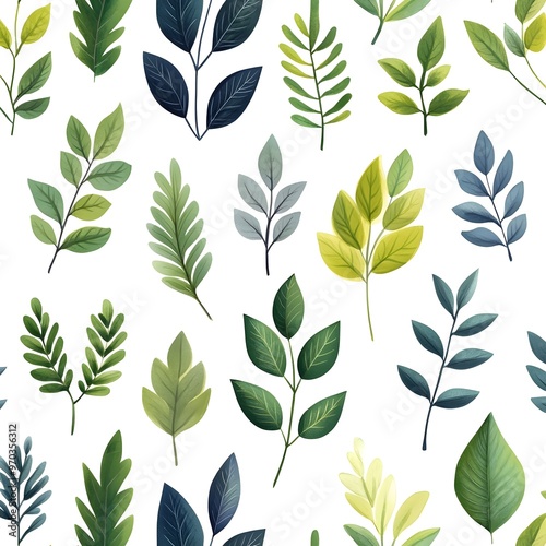 Seamless Botanical Pattern with Lush and Fresh Foliage on White Background