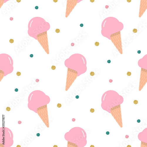 seamless colorful ice cream in a waffle cone with gold dot glitter on white background