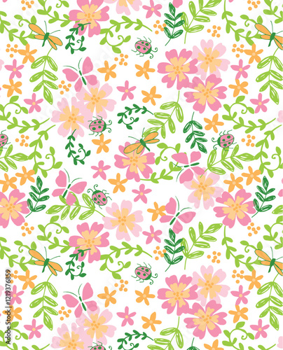 floral, dense, pink, coral, flower, seamless, pattern, vector, colourful, pastel, textile, spring, surface, design, botanical, nature, wrapping paper, fashion, hand-drawn, children, illustration, blossom, garden, decorative, background, floral pattern, fabric design, girlie, repeated, gentle, cheerful, stylish, modern, cute, wallpaper, trendy, wrapping, playful