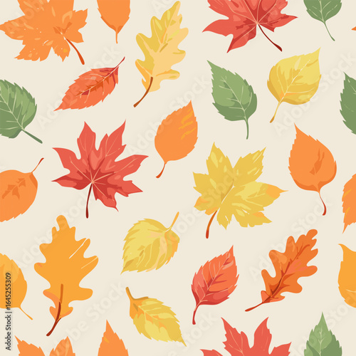 Seamless fall pattern with colorful hand-drawn leaves in orange, red, yellow, and green on a light background. Perfect for autumn-themed designs
