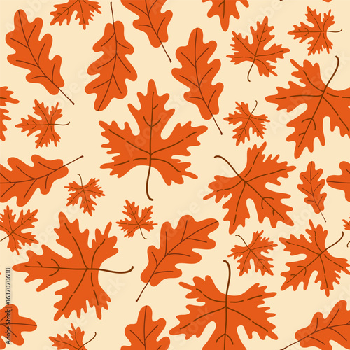 Seamless flat vector pattern featuring orange autumn leaves on a light background. Suitable for seasonal textiles, wallpapers, wrapping paper, and autumn-themed designs.