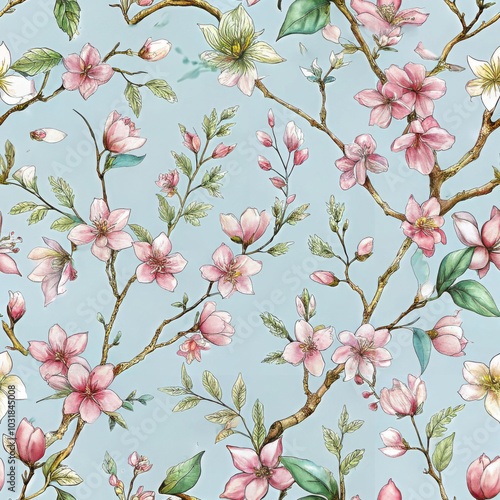 floral, seamless, pattern, cherry, blossom, pink, blue, background, flower, branch, green, leaf, delicate, nature, spring, blooming, botanical, design, soft, elegant, fresh, natural, pastel, artistic, vintage, decorative, texture, garden, romantic, illustration, beauty, foliage, feminine, countryside, hand-drawn, graceful, springtime, light, airy, watercolor