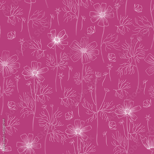 Seamless floral pattern, Kosmos flower line art, Kosmeya hand drawn illustration, wild flower astra isolated on pink backround, decorative backdrop design for greeting card, wedding invitation