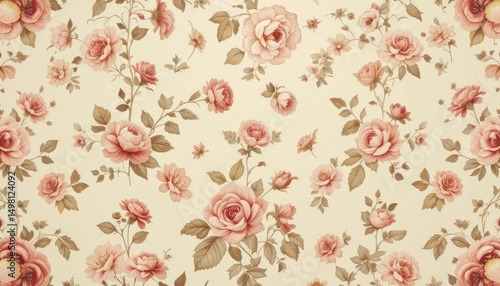 Seamless floral wallpaper design featuring vintage pink roses and blossoms