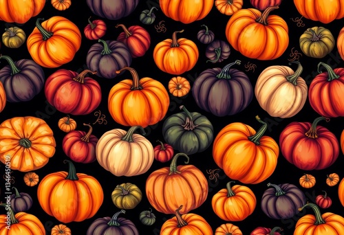 Seamless Halloween pattern featuring various pumpkins in diverse shapes, sizes, and colors on a dark background , october, vegetable
