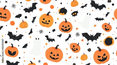 Seamless Halloween Pattern with Bats, Pumpkins, and Ghosts on White Background