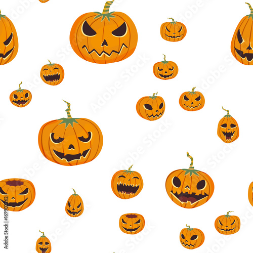 Seamless halloween pattern with carved pumpkinst. Jack-o-lantern. Vector illustration, isolated on white background. Fabric print design.