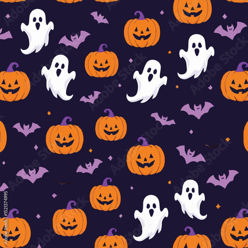 Seamless Halloween pattern with cute ghosts, jack-o'-lanterns, and bats on dark purple background.