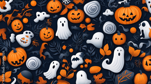Seamless Halloween pattern with pumpkins, ghosts, spiders, bats, and leaves. Dark background with bright orange and white illustrated elements.