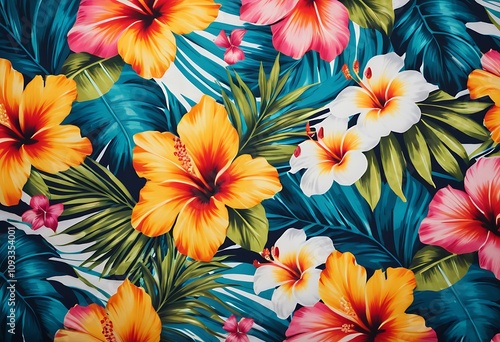 Seamless hand drawn tropical pattern with bright hibiscus flowers and exotic palm leaves on dark background.