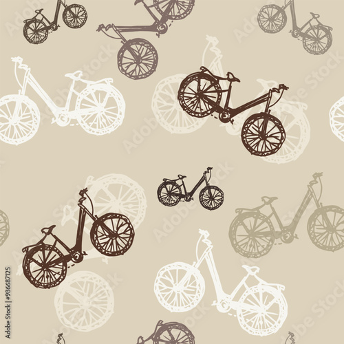 bicycle, seamless, pattern, texture, background, wallpaper, wrapping, textile, print, fabric, ornament, decor, decorative, decoration, clothes, design, stencil, art, template, repeating, paper, illustration, package, surface, graphic, tour, road, vignetting, silhouetted, beige, brown, light, monochrome, ride, wheel, trip, vehicle, sport, adventure, travel, biking, bike, grey, grey, speed, race, recreation