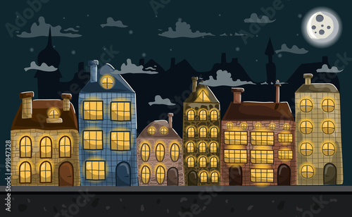 street, vector, cartoon, night, town, building, retro, road, window, old, scene, season, seamless, roof, urban, design, decoration, city, house, banner, vintage, style, pattern, exterior, happy, landscape, moon, chimney, game, shine, tower, apartment, cloud, row, star, skyline, light, evening, layer, dark, texture, architecture, neon, sky, unless, silhouette, unending, city landscape