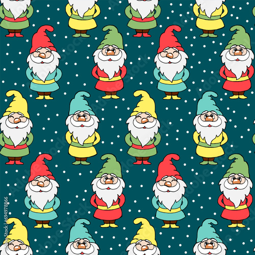 Seamless pattern, cute gnomes on a background with snow. Print, children's textile, vector