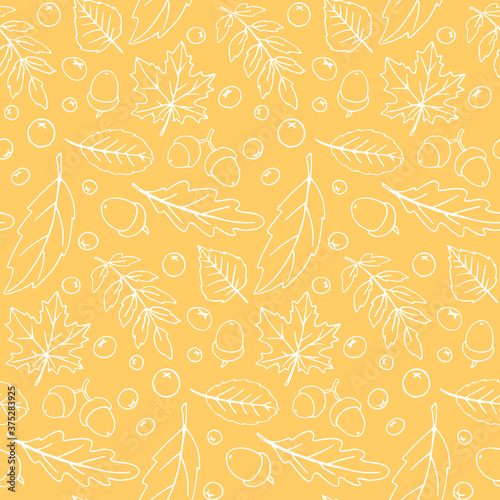 seamless, pattern, leaf, leaf, autumn, vector, texture, background, outline, doodle, fall, contour, leaf fall, defoliation, drawn, season, nature, forest, acorn, berry, foliage, vintage, retro, wallpaper, plant, card, decor, line, greeting, design, vignetting, garden, happy, symbol, isolated, natural, fabric, textile, maple, rowan, birch, oak, aspen, thanksgiving, flora, illustration, orange, brown, yellow