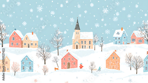 Seamless pattern of a quaint winter town featuring colorful houses, trees, and a church on a light blue background, perfect for Christmas cards with space for text.