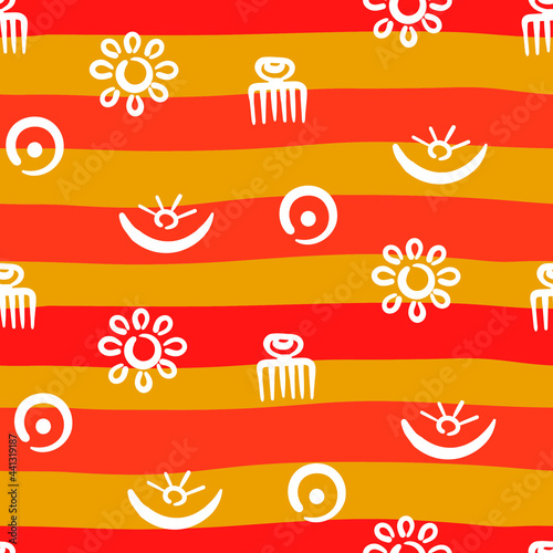 Seamless pattern of abstract symbols of African tribes. Ritual screen printing. African Adinkra drawings of ancient ethnic symbols of the peoples and tribes of Ghana. Vector Art hand-painted