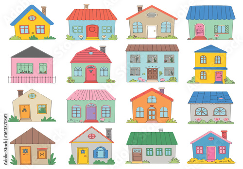 Seamless pattern of cartoon houses, apartments, and buildings with windows and roofs for a vibrant city or town design