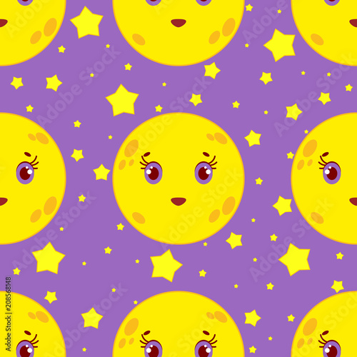 Seamless pattern of cartoon smiling moon with stars on purple background