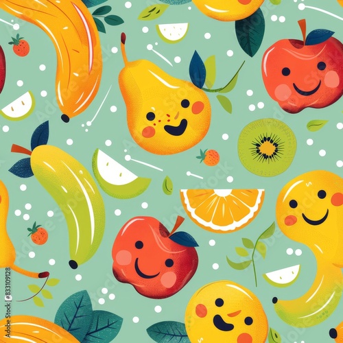 seamless pattern of cheerful dancing cartoon fruits