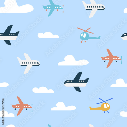 Seamless pattern of childish cute air plane or transportation with cloud and blue background