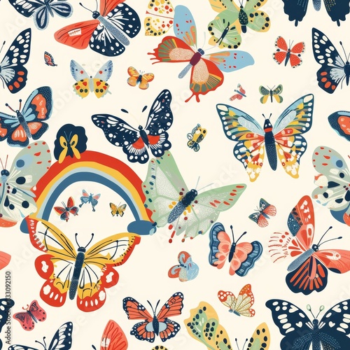 seamless pattern of colorful butterflies and rainbow arch