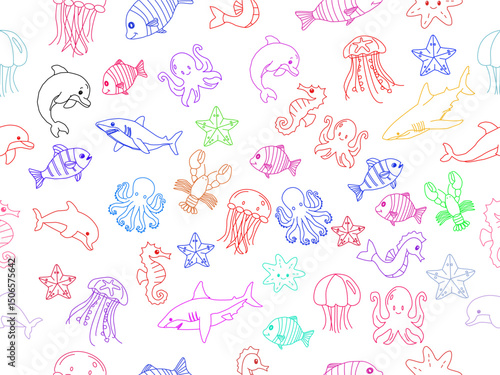 Seamless pattern of colorful hand-drawn sea animals. seamless pattern with sea animals. Cute hand drawn sea animals doodle set. Ocean and sea animal set. Collection of aquatic creature.