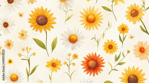 Seamless pattern of daisies and sunflowers arranged on vintage paper texture, light brown and cream hues