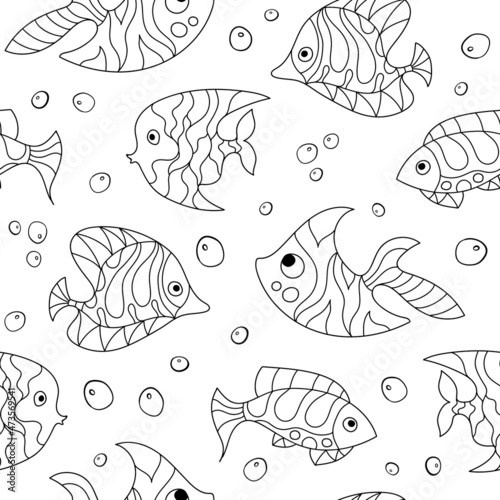 Seamless pattern of fantasy monochrome psychedelic, creative doddle fish. Zen art creative design collection on white background. Vector illustration.